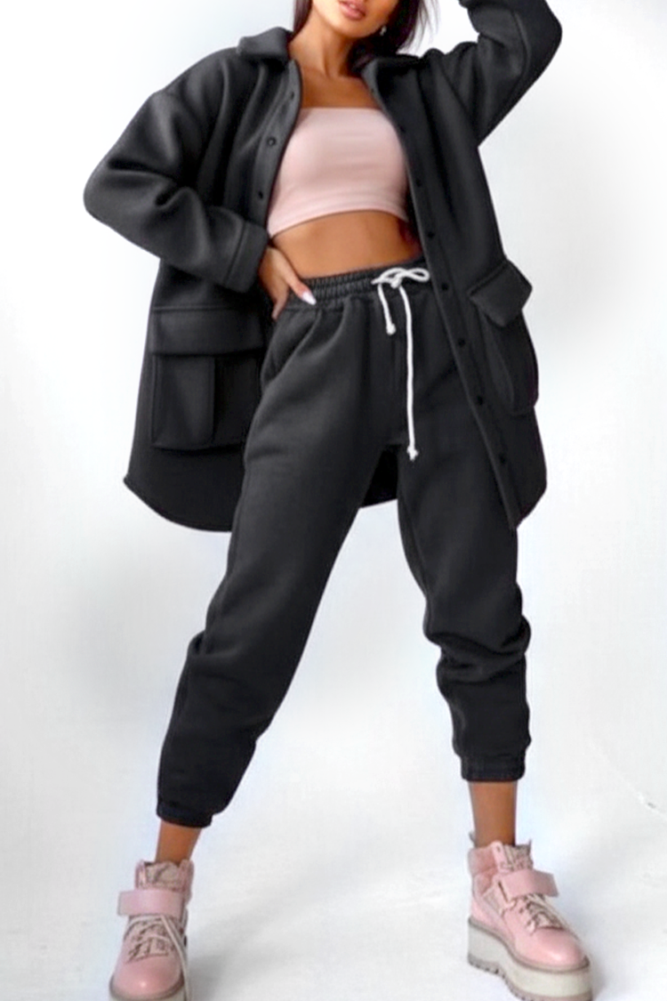 - Az ing sportos kialakítású, gombokkal és zsebekkel rendelkezik, a nadrág pedig magas és rugalmas derékkal rendelkezik.