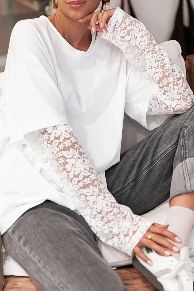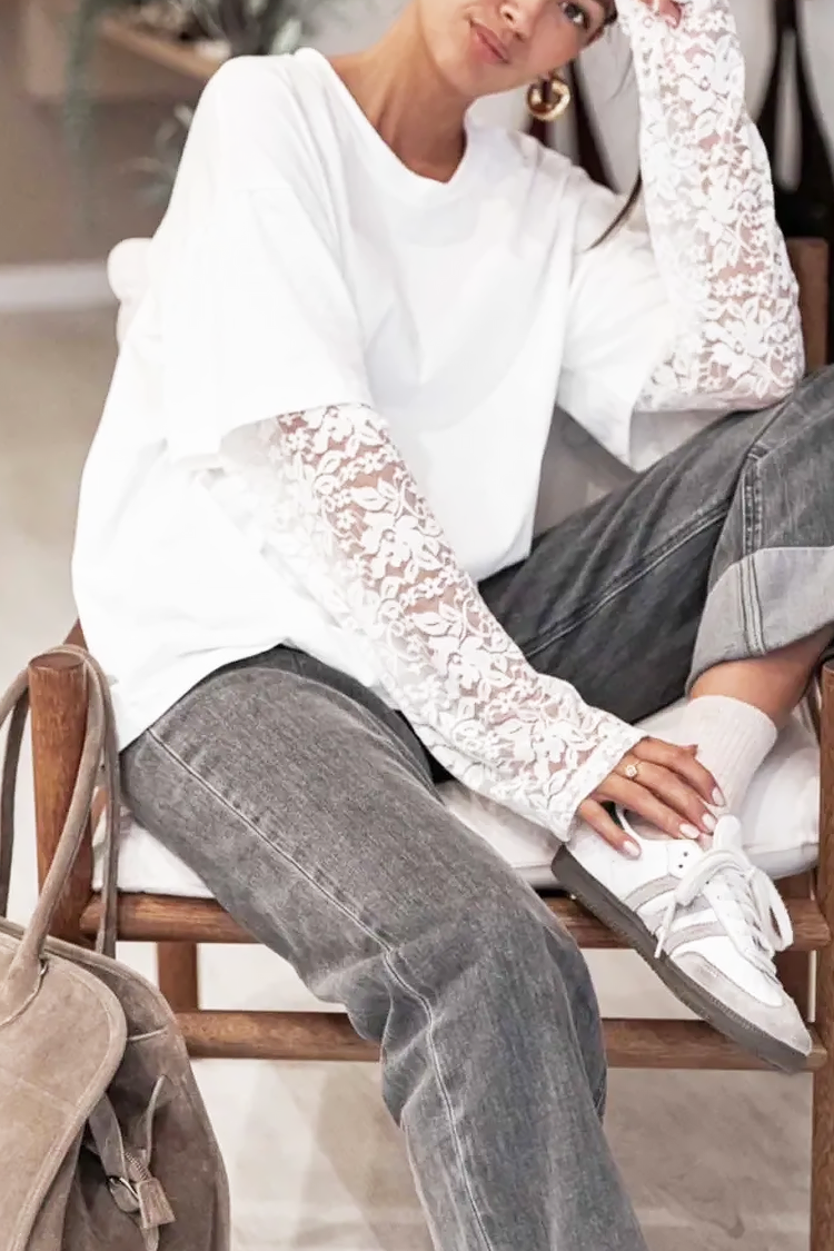 - A modell kényelmes szabással és pólószerű kialakítással rendelkezik, amelyet látványos csipkével díszített hosszú ujjak egészítenek ki.