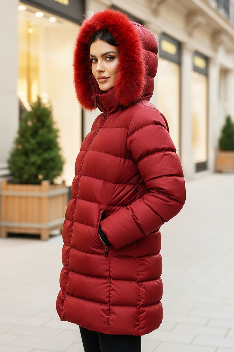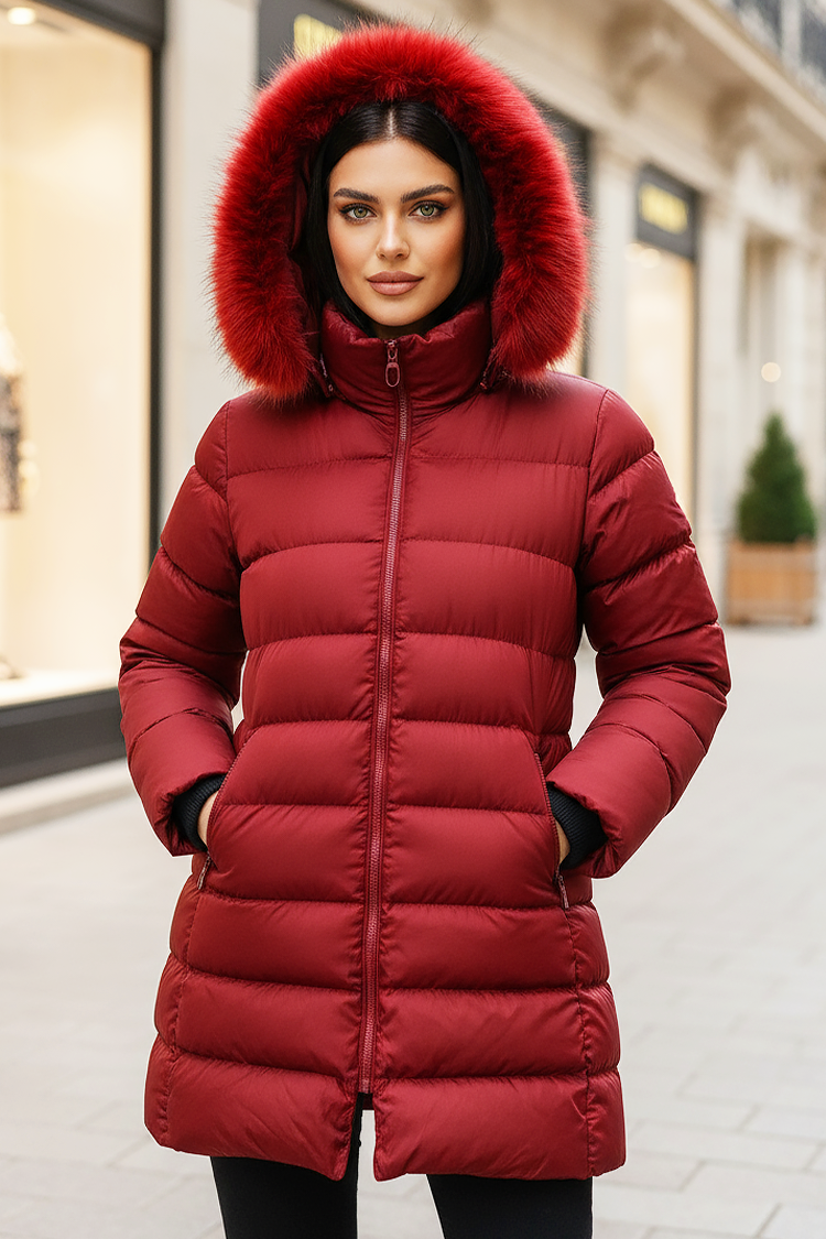 - A modell kényelmes szabással, cipzárral záródik, praktikus zsebekkel és szörme kapucnival rendelkezik.