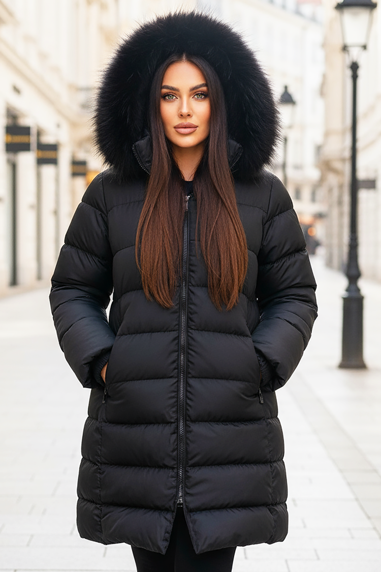 - A modell kényelmes szabással, cipzárral záródik, praktikus zsebekkel és szörme kapucnival rendelkezik.