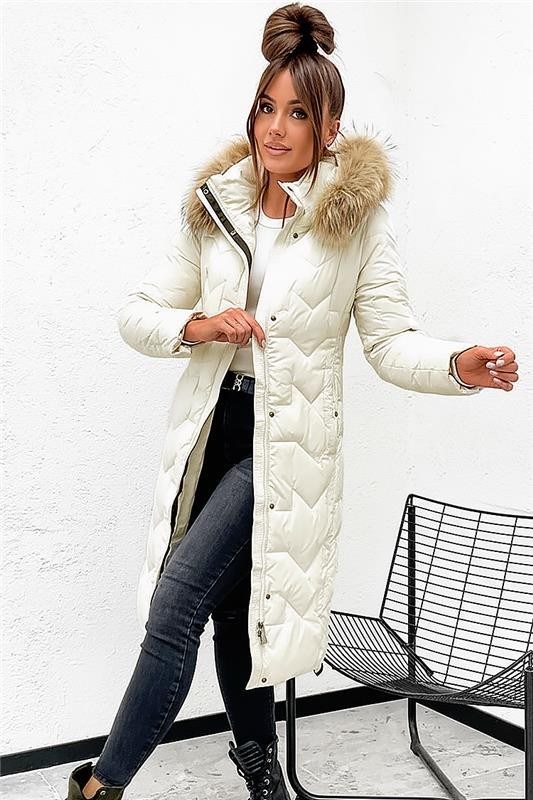 - A modell kényelmes szabással, praktikus zsebekkel, dupla cipzáras és gombos záródással, valamint szörmés kapucnival rendelkezik.