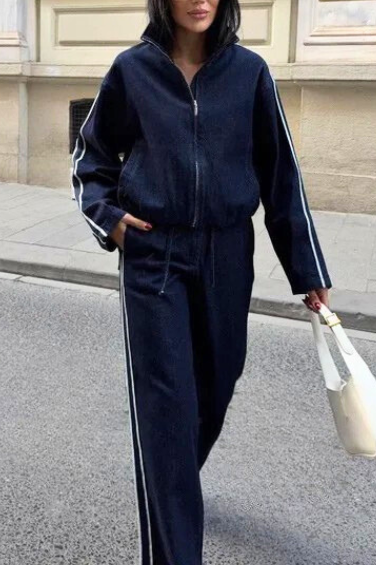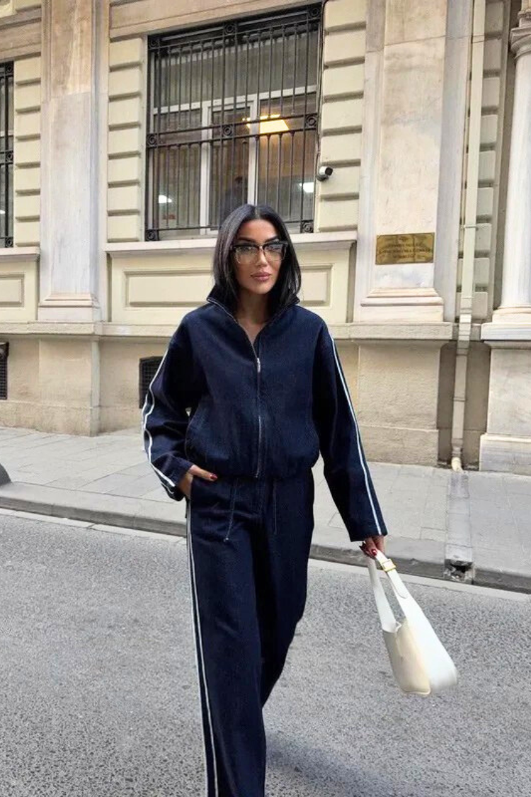 - A nadrág magas derekú és bő szabású, a dzseki pedig látványos, magas gallérral és cipzárral rendelkezik.