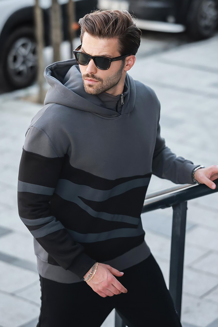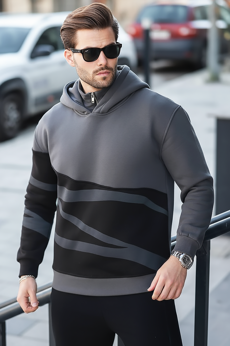 - Sportos-lezser férfi pulóver cipzárral, kapucnival és látványos mintával.