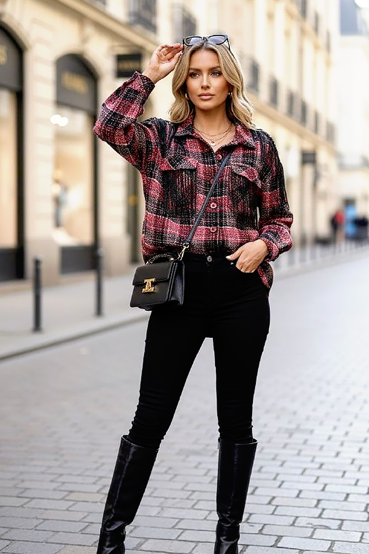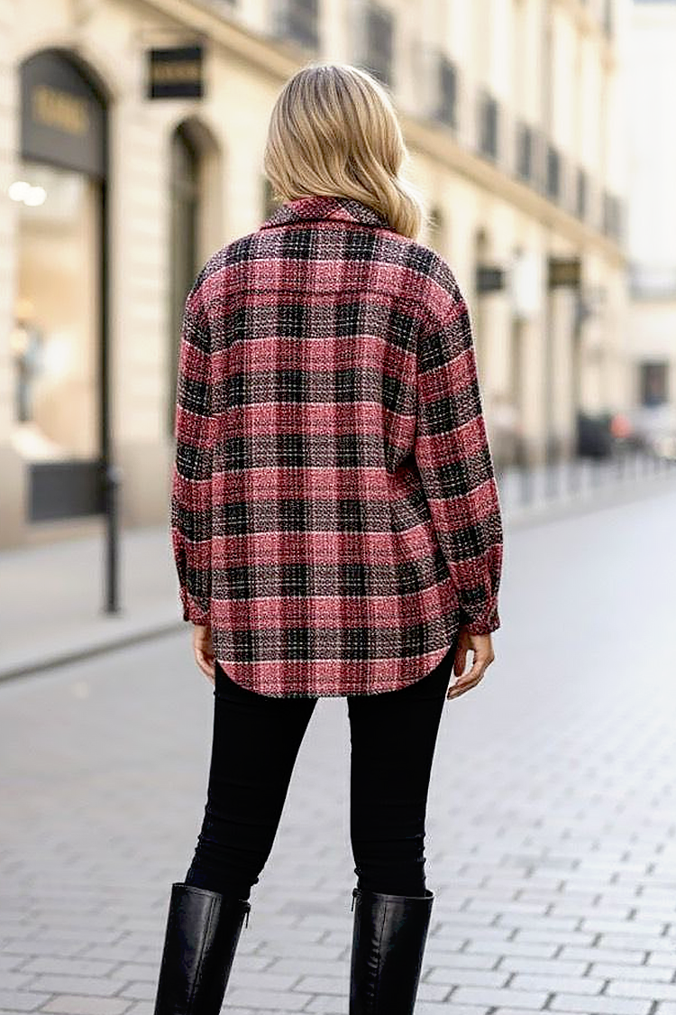 - A modell kockás mintával és standard gombos rögzítéssel rendelkezik a teljes hosszában.