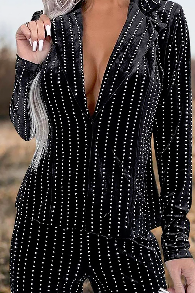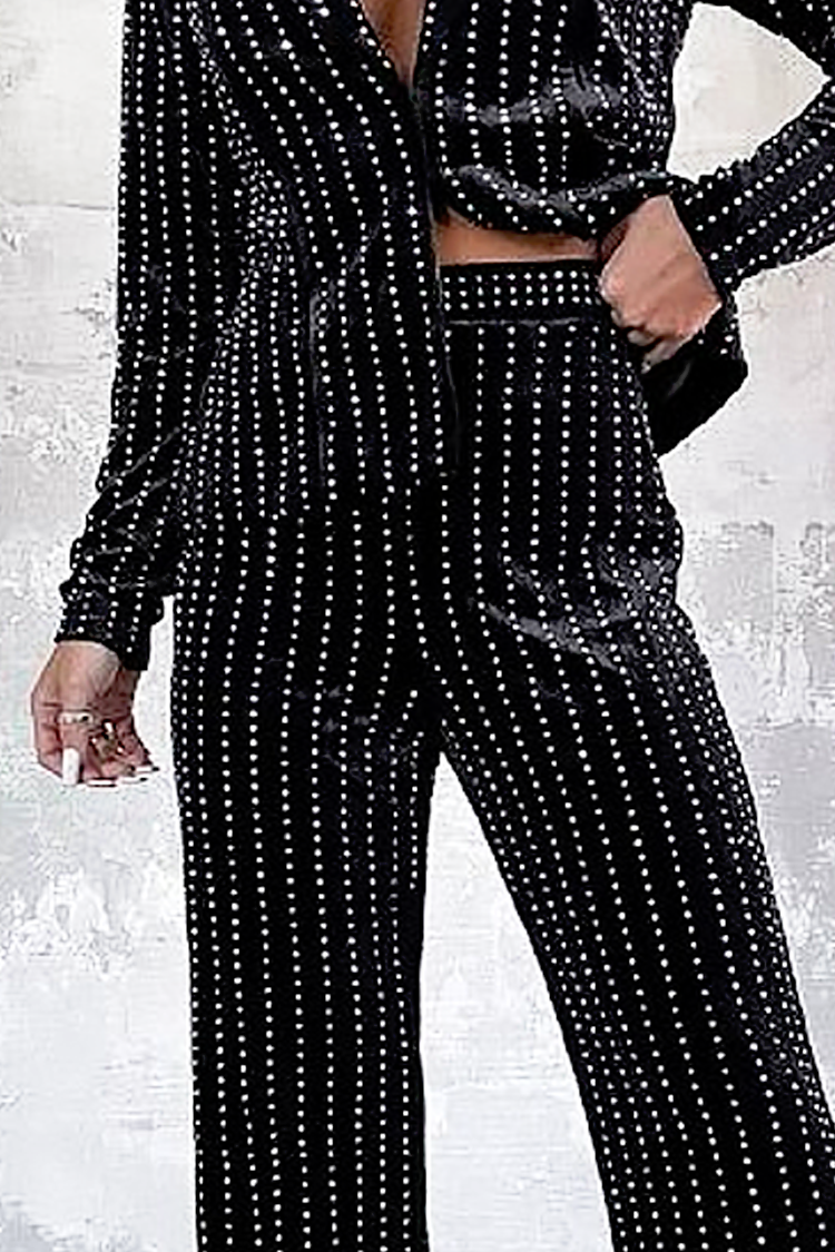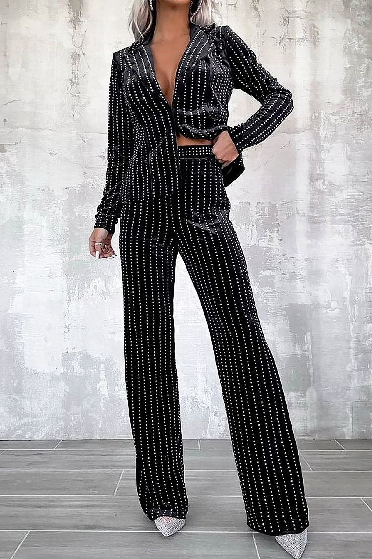 - A blézer galléros és klasszikus hosszúságú, a nadrág pedig bő szabású.