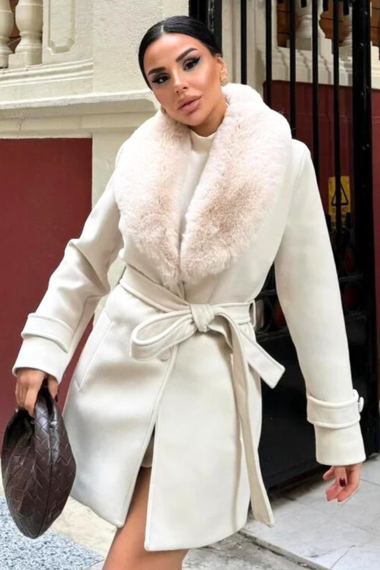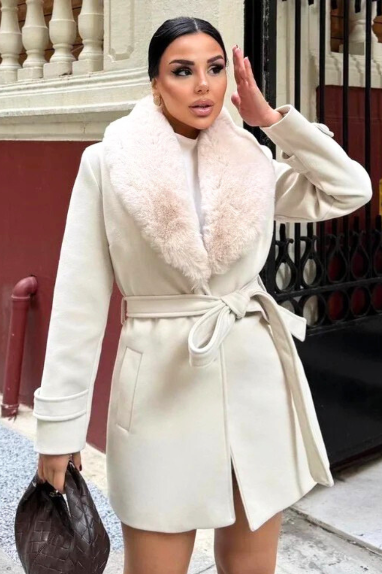 - A modell klasszikus szabású, levehető szőrmegallérral és ugyanabból az anyagból készült övvel rendelkezik.