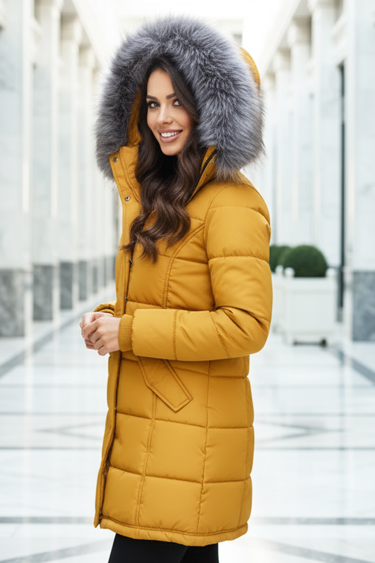 - A modell kényelmes szabással, cipzárral záródik, praktikus zsebekkel és szörmés kapucnival rendelkezik.