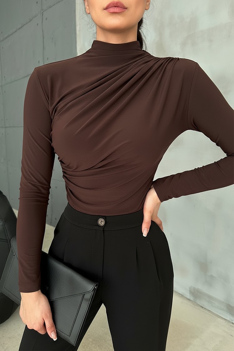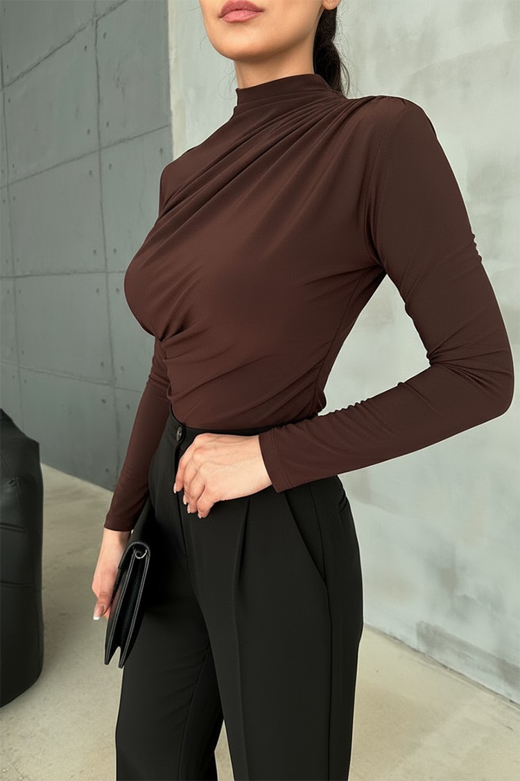 - A felső hosszú ujjú, látványos szabású és elegáns magas nyakú.