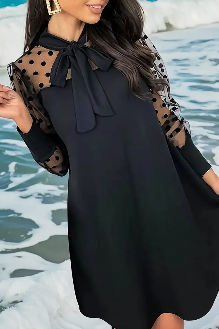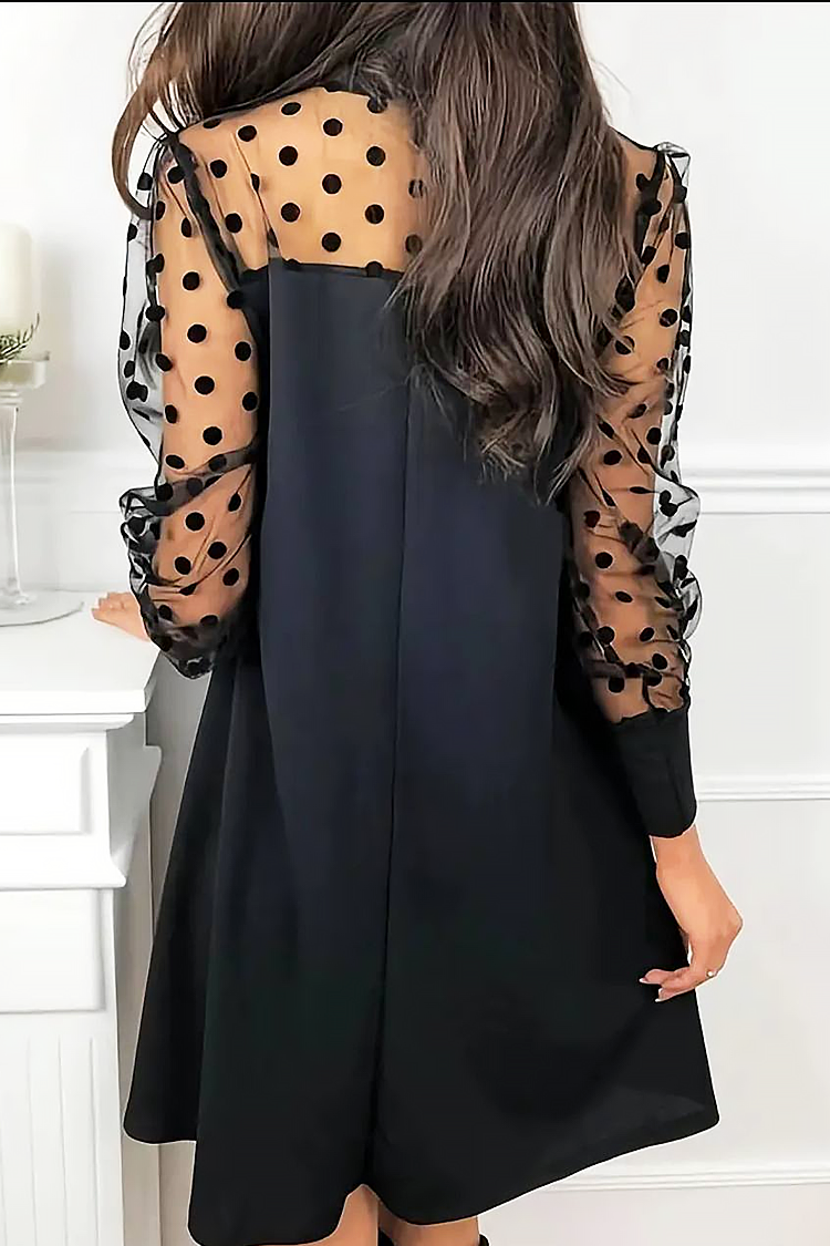 - A modell laza szabású, látványos nyakmegoldással és pöttyös mintás tüll ujjal rendelkezik.