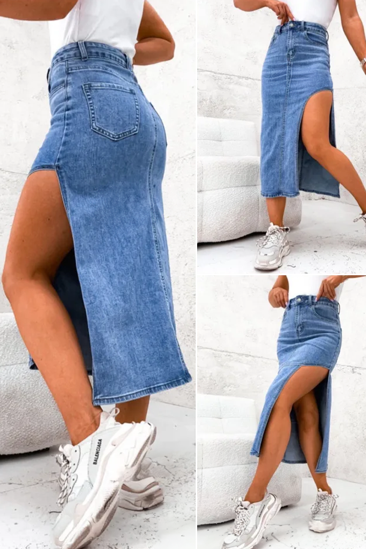 - Stílusos és szexi farmer midi szoknya, amely alkalmas mindennapi és divatos megjelenésre.