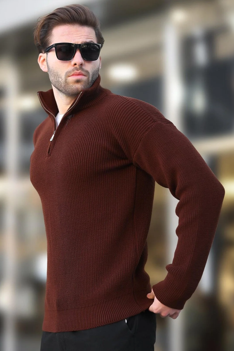 - Modern férfi pulóver magas nyakkal és cipzárral, amely alkalmas kiegészítője a mindennapi öltözéknek.