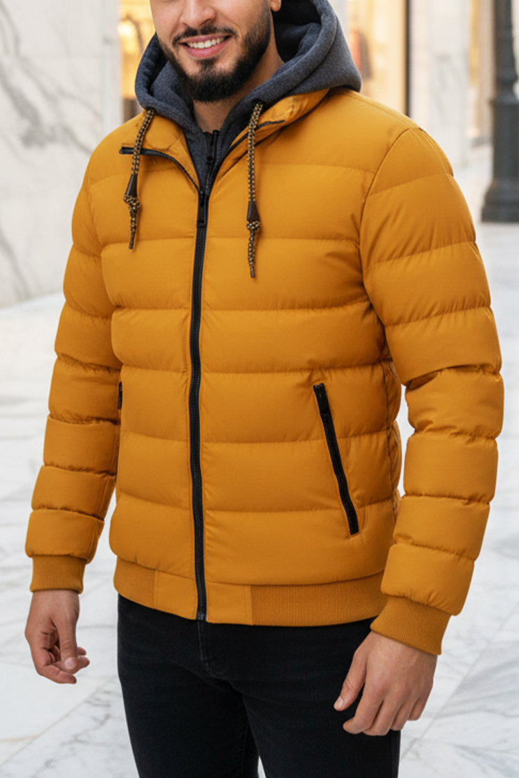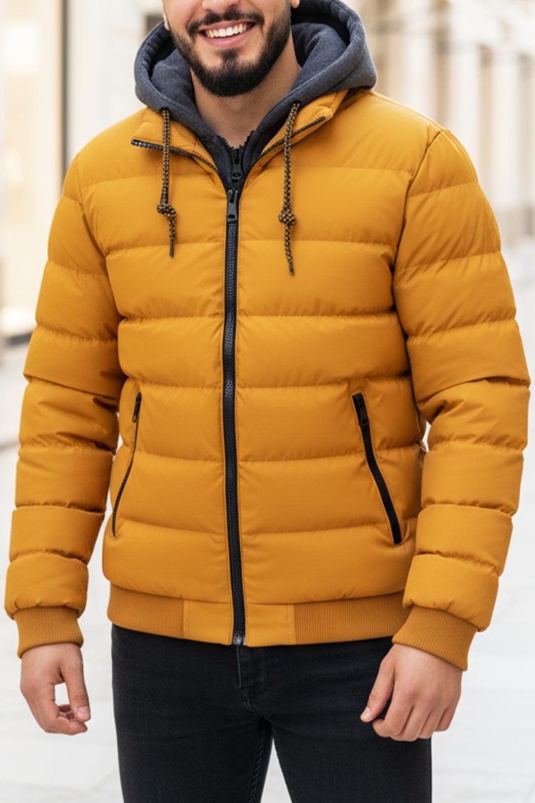 - Trendi steppelt férfi dzseki mustársárga színben, amely ötvözi a kényelmet és a modern városi dizájnt.