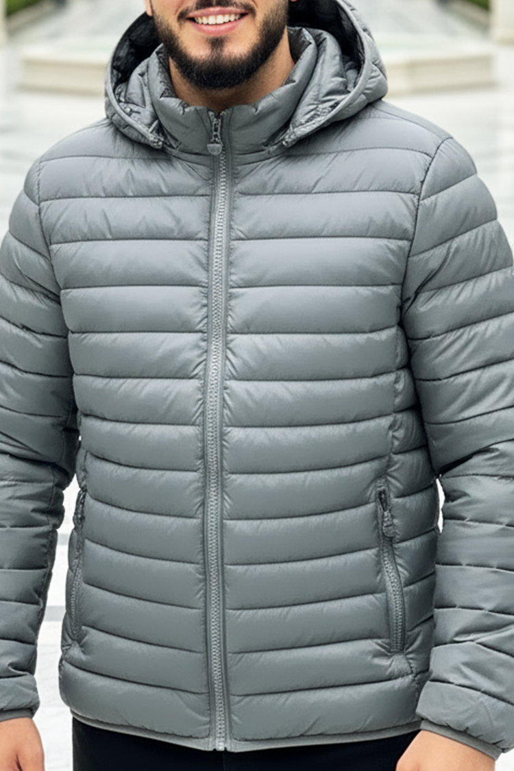 - Kényelmes férfi dzseki vízszintesen steppelt, levehető kapucnival szürke színben, sportos-hétköznapi stílusban.