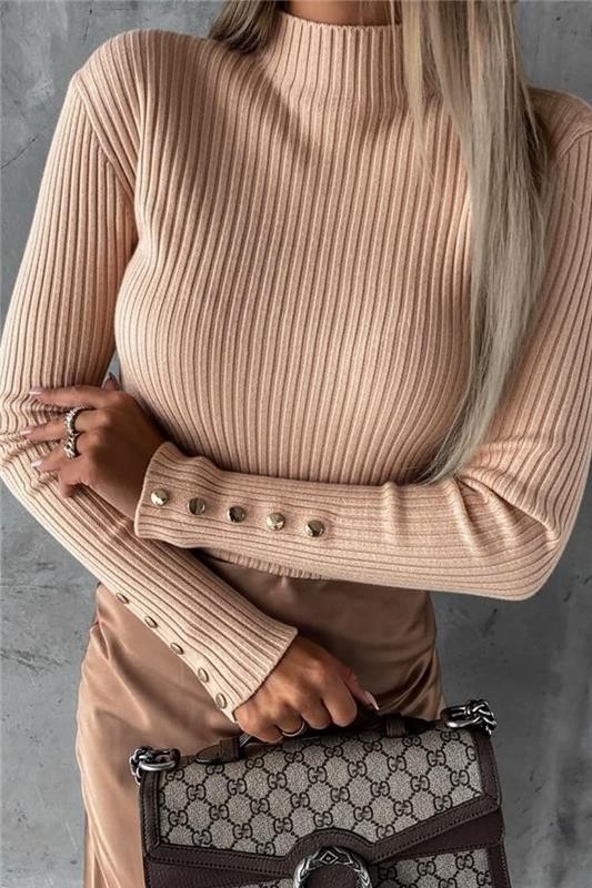 - A modell hosszú, gombos ujjakkal, testhezálló szabással és stílusos magas nyakkal rendelkezik.
