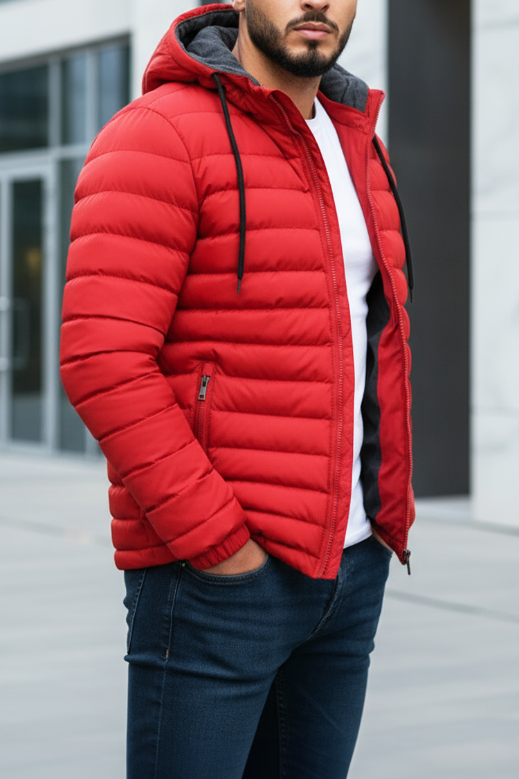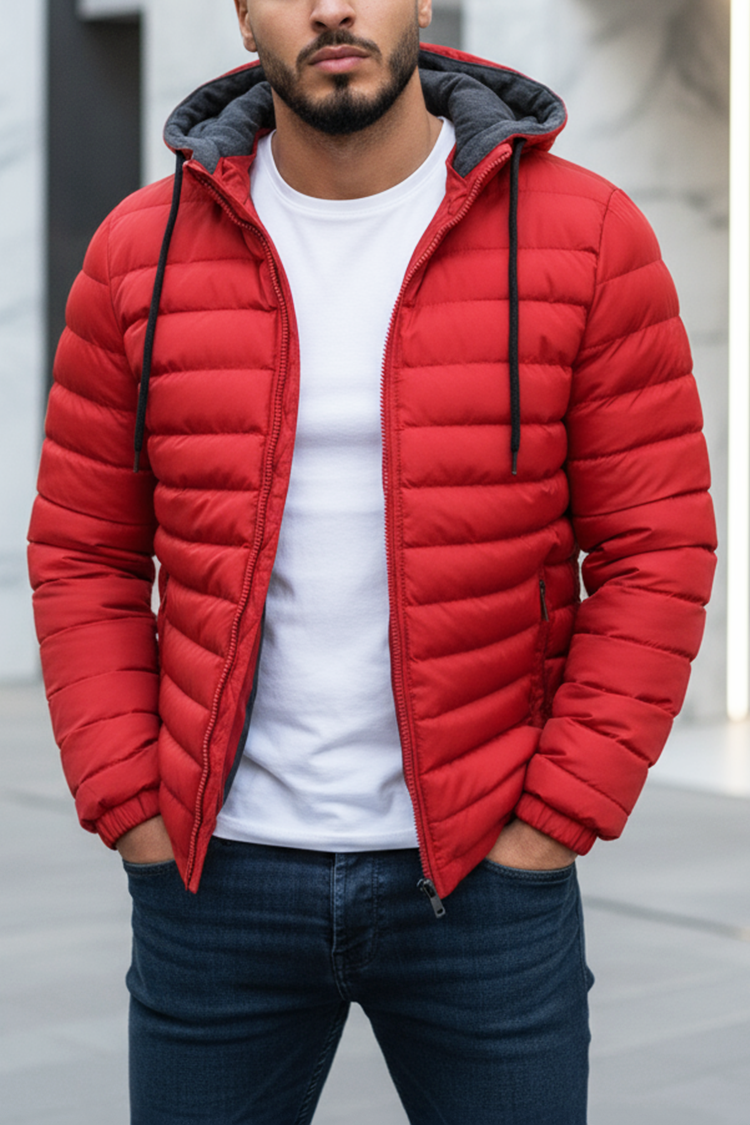- Bemutatjuk különleges ajánlatunkat: férfi téli dzseki divatos dizájnnal, piros színben.