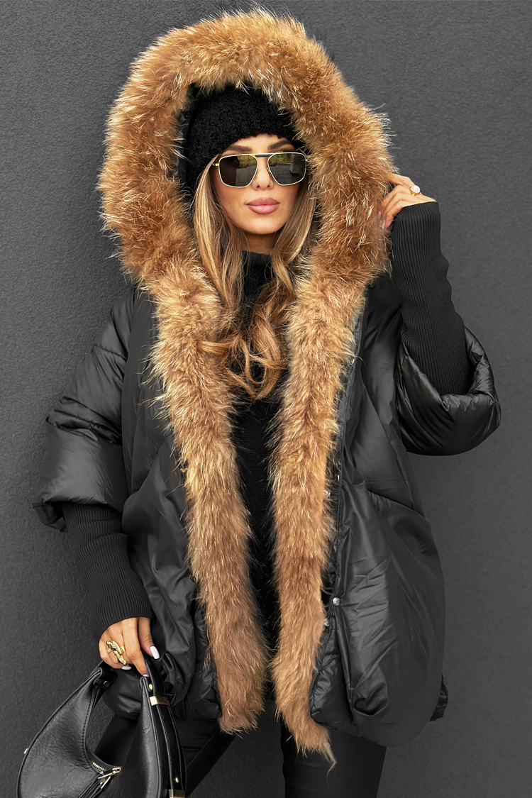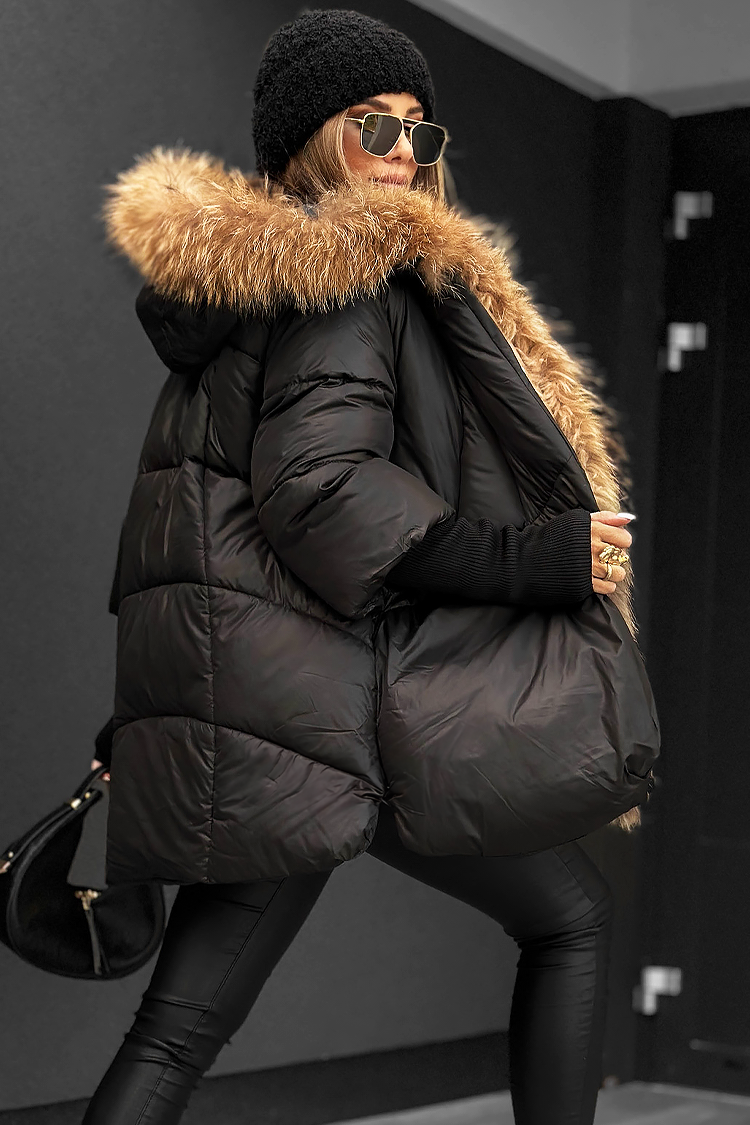 - A modell kényelmes szabással, gombos rögzítéssel, bő kapucnival és teljes hosszában szörmével rendelkezik.