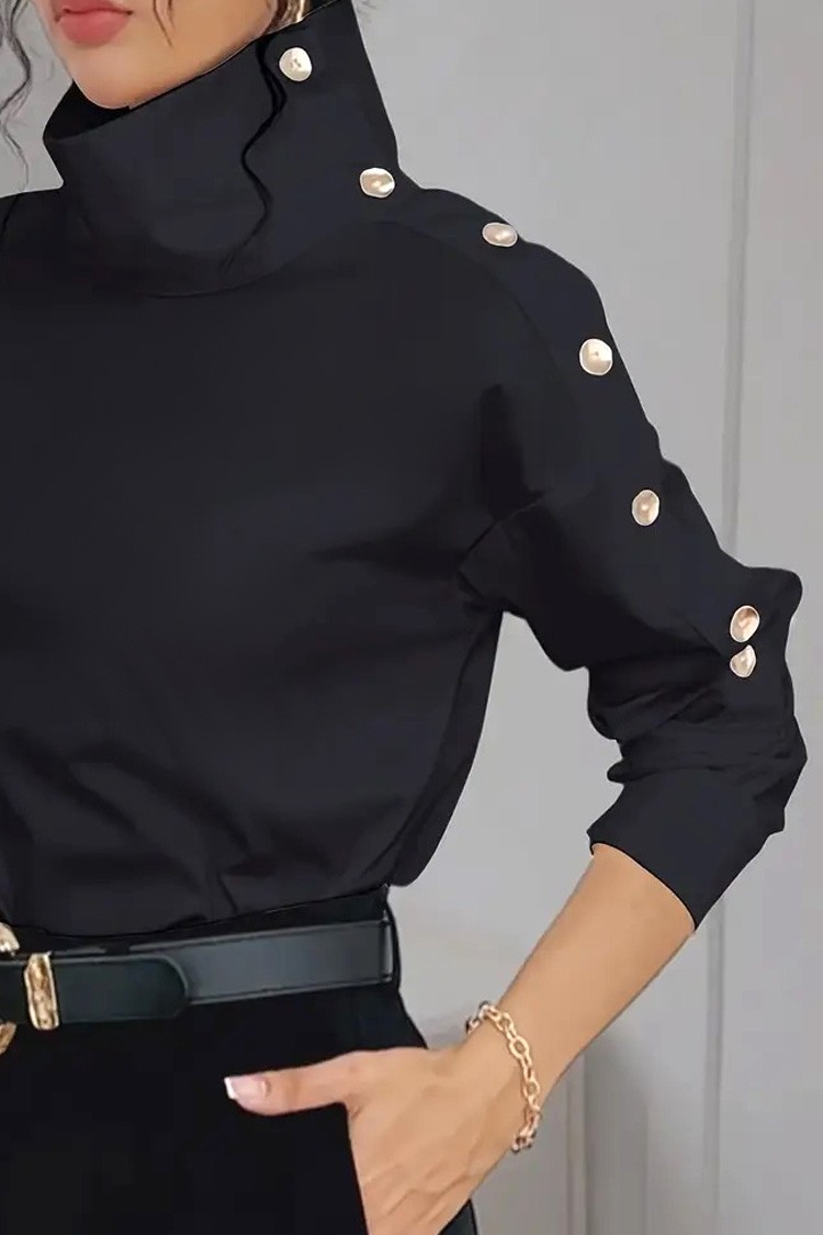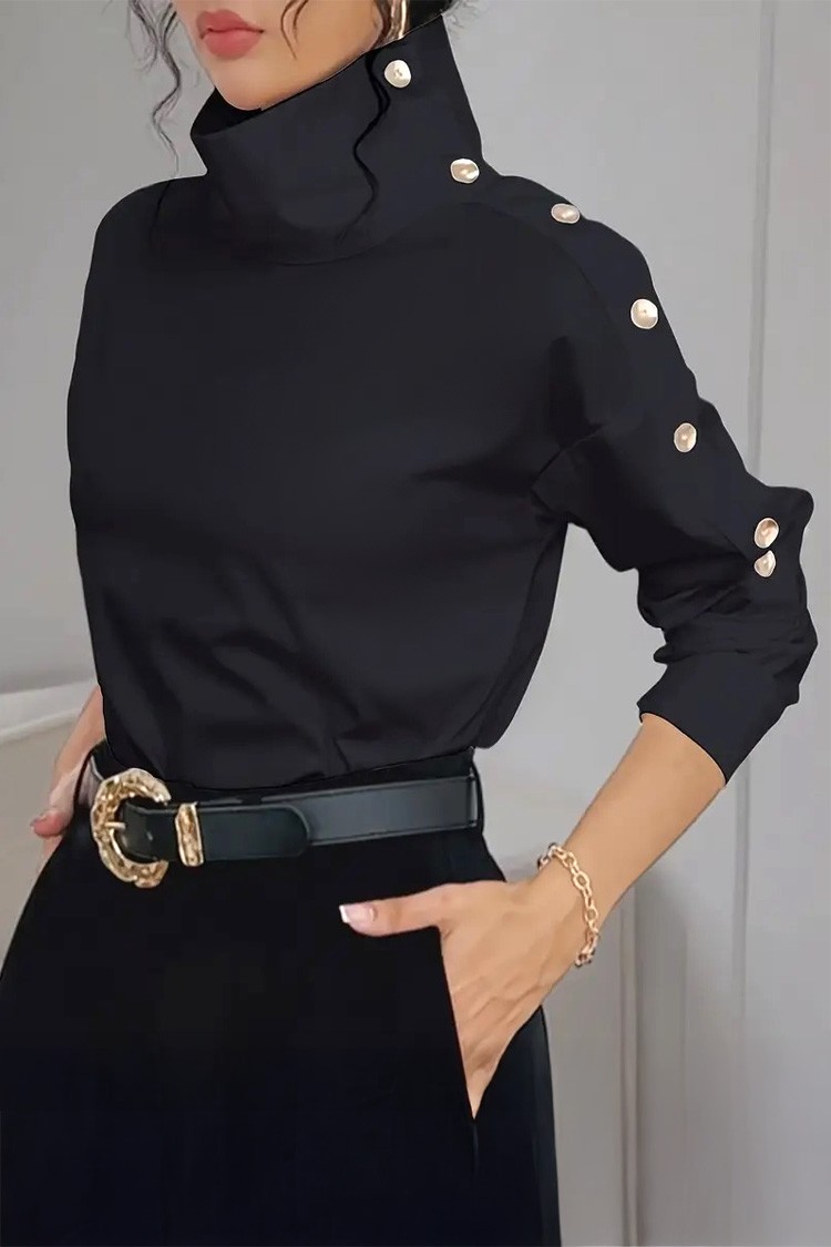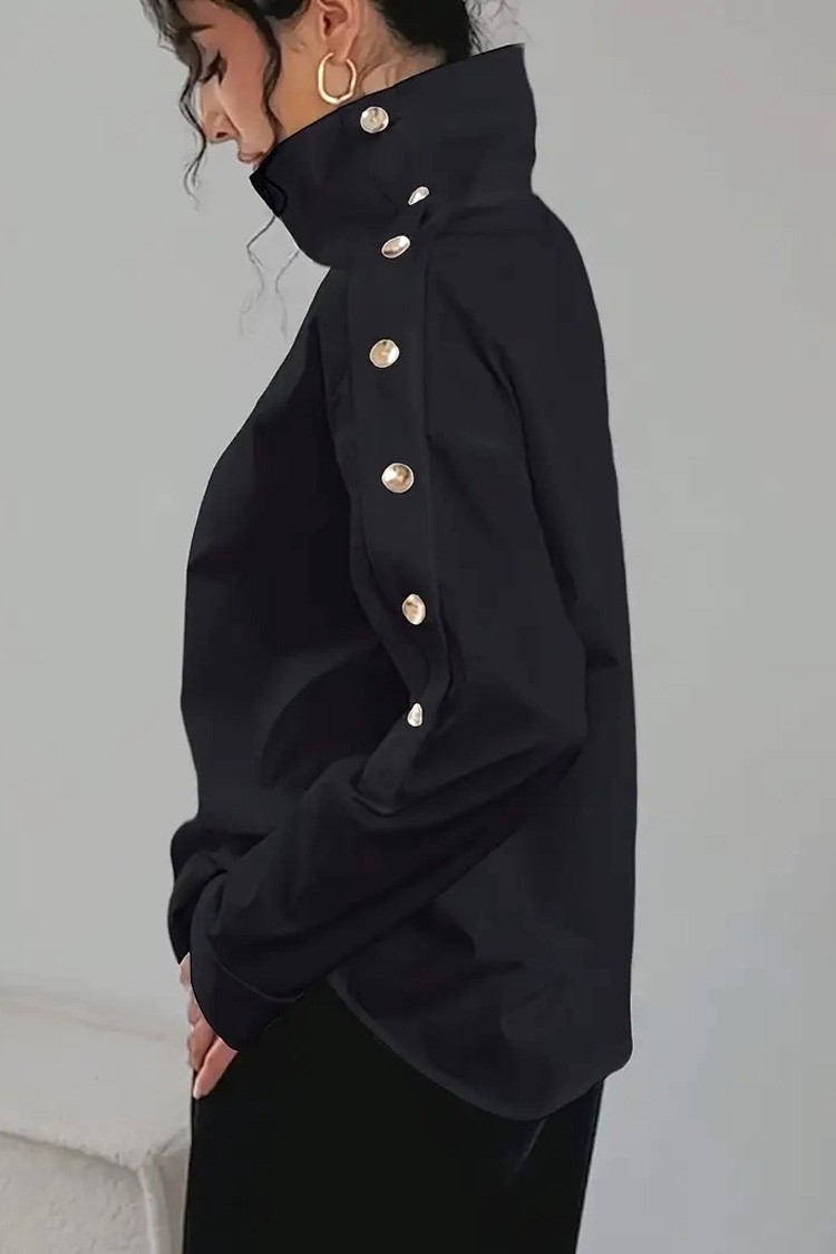 - A blúz elegáns gallérral, arany gombokkal és ejtett vállal is viselhető.