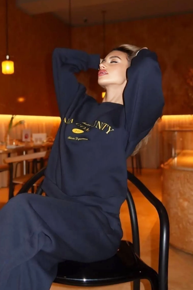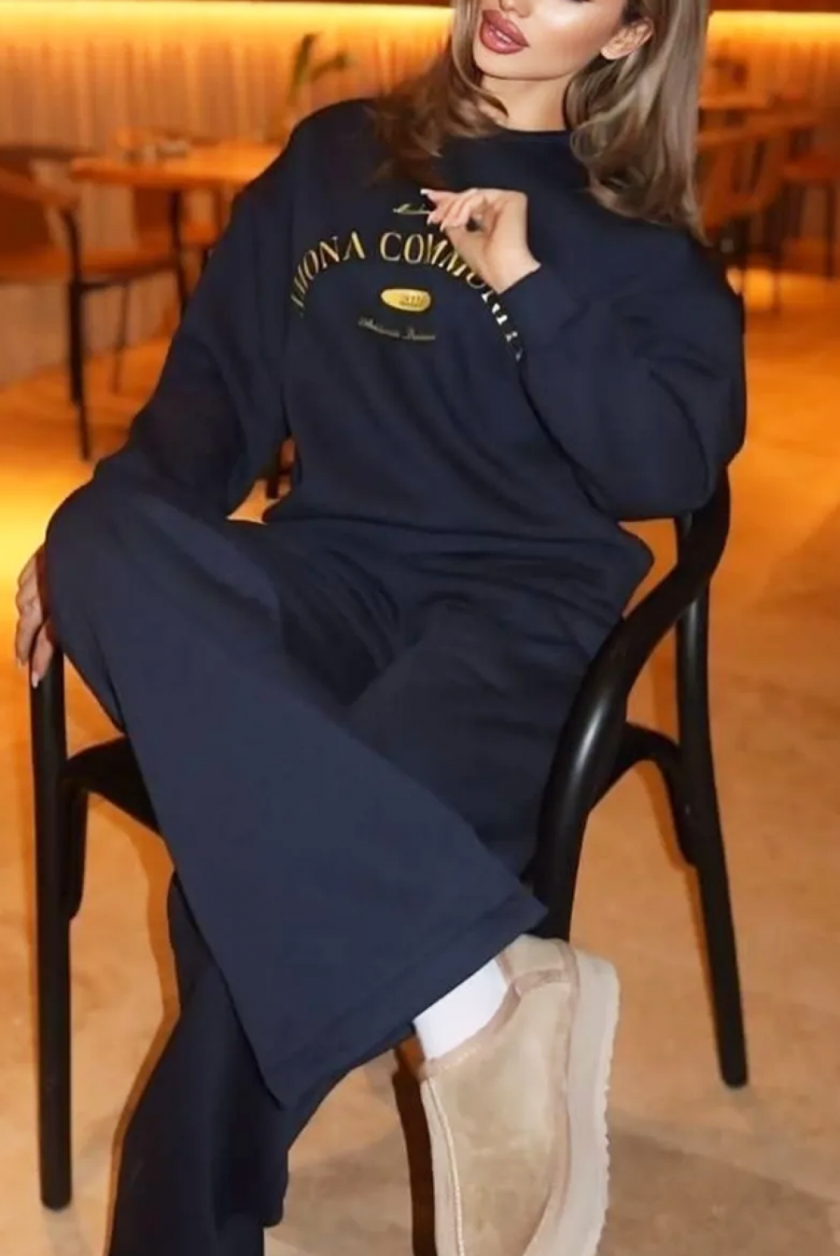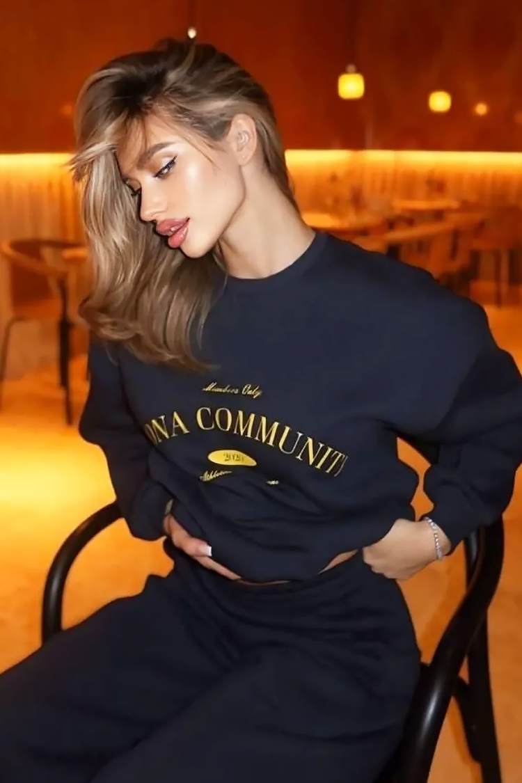 - A felsőrész egy laza és klasszikus szabású pulóver, látványos felirattal.