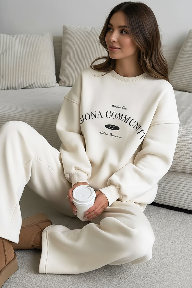 - A felsőrész egy laza és klasszikus szabású pulóver, látványos felirattal.