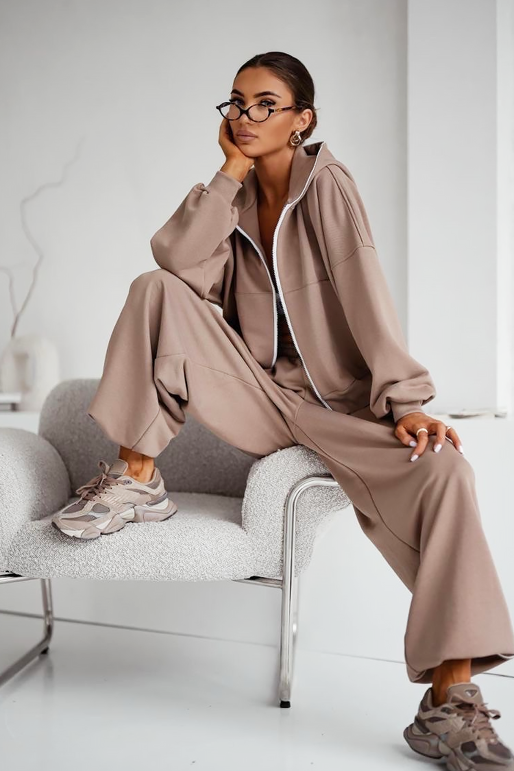 - A felsőrész egy bő és klasszikus szabású kardigán cipzárral és kapucnival.