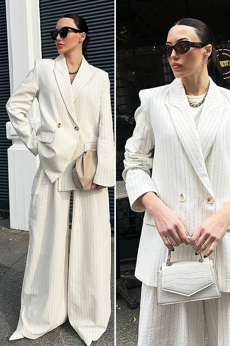 - Vonzó, kétrészes szett, amely nadrágból és blézerből áll, alkalmas irodába és különleges eseményekre.