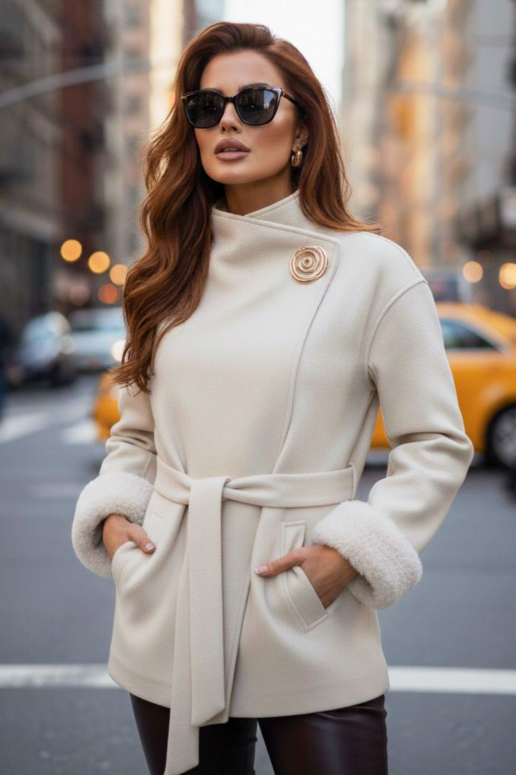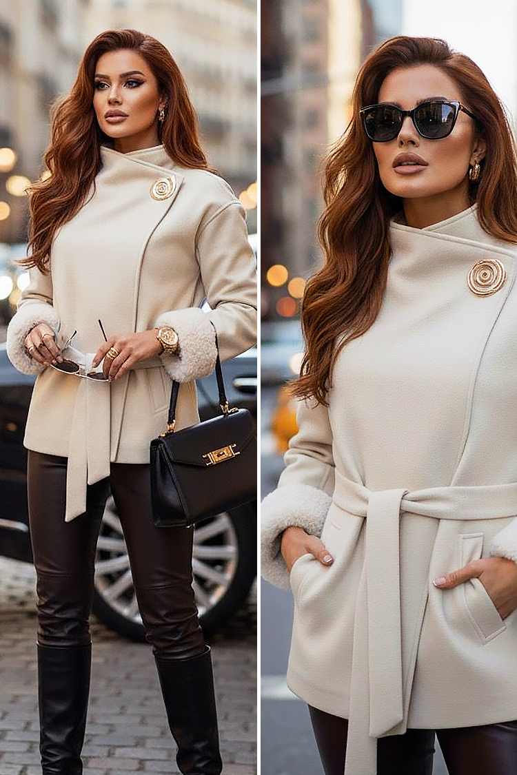 - A modell kényelmes szabással, gallérral, ugyanabból az anyagból készült övvel és látványos szörmés mandzsettával rendelkezik az ujjakon, látványos brosssal.