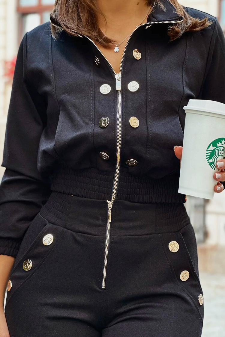 - A felsőrész rugalmas derékkal rendelkezik, cipzárral és gombokkal rögzíthető.