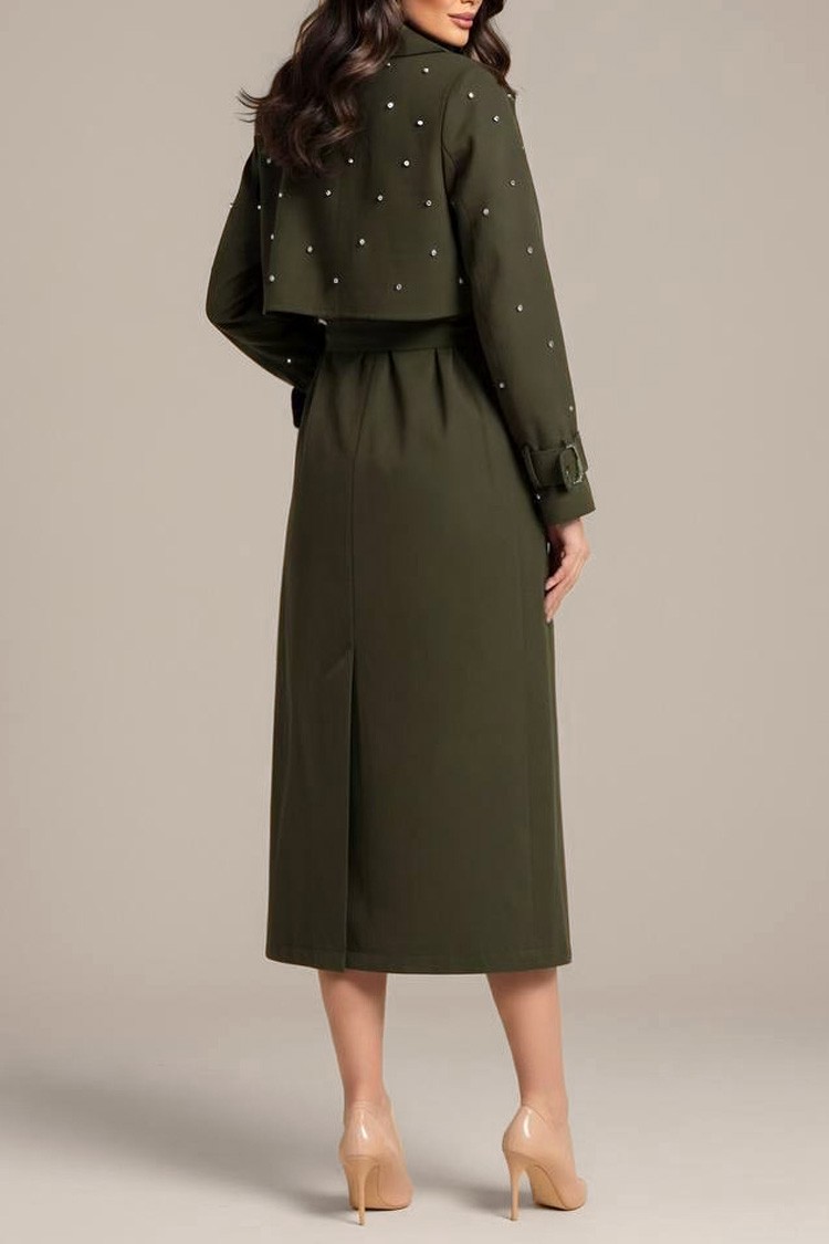 - A modell klasszikus szabású, övvel és mandzsettával, csattal, díszgyöngyökkel és egy kiemelt rózsával a galléron.