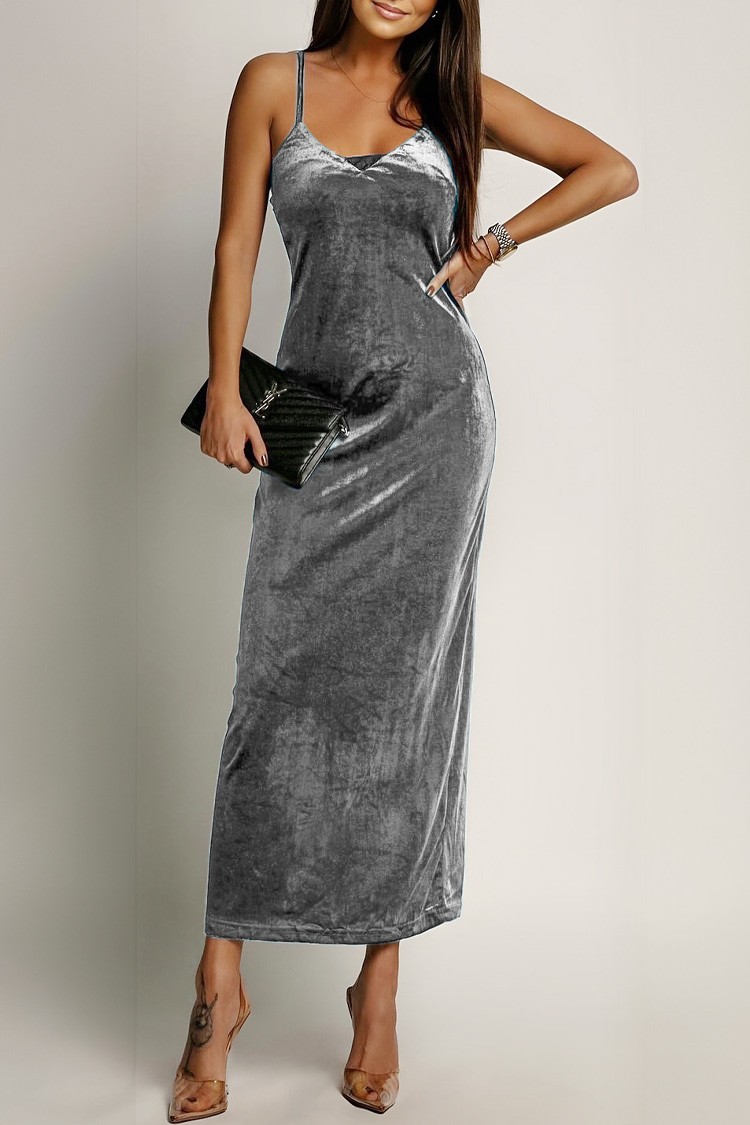 - A ruha testhezálló szabású, vékony pántokkal és hosszú fazonnal rendelkezik. A modell hátul rejtett cipzárral záródik.