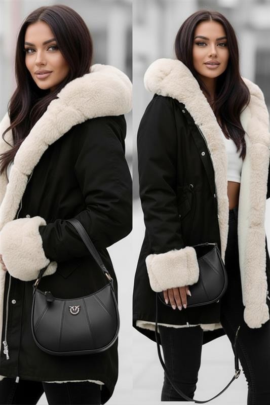 - A modell kényelmes szabással, gombos és cipzáras záródással, bő kapucnival, szörmével, valamint mandzsettával rendelkezik.