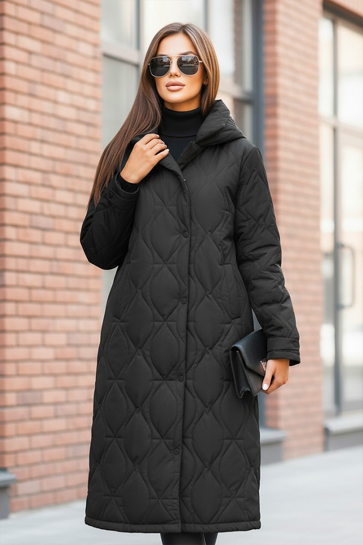 - A modell kényelmes szabással, gombos rögzítéssel, midi hosszban, stílusos gallérral és zsebekkel rendelkezik.