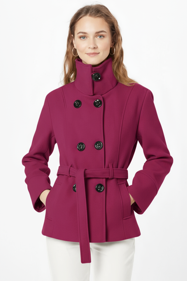 - A modell stílusos gallérral, hatékony gombos rögzítéssel és ugyanabból az anyagból készült övvel rendelkezik.