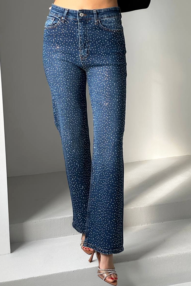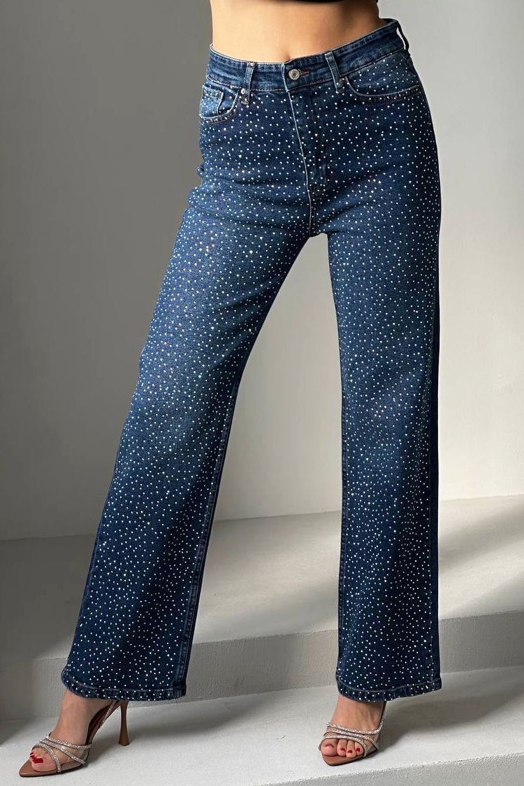- A modell magas derekú, széles szárú, zsebes elöl csillogó részletekkel rendelkezik.