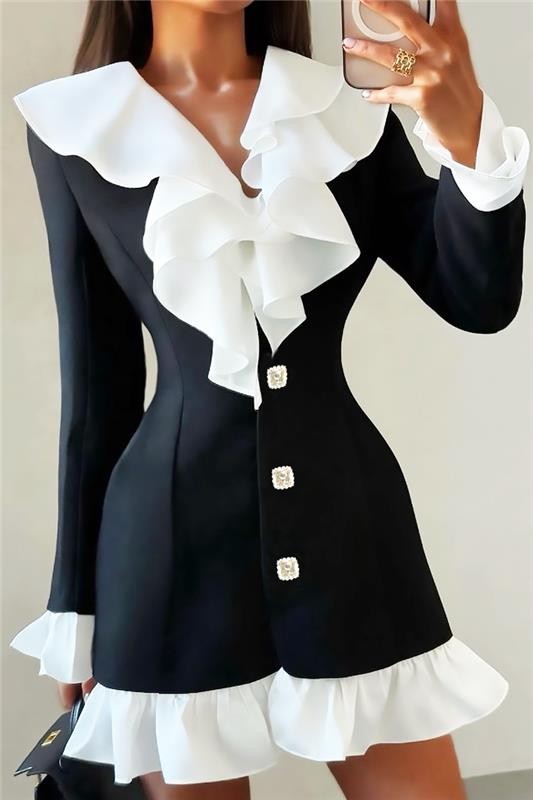 - A modell testhezálló és klasszikus szabású, hosszú ujjú, stílusos gombokkal és látványos fehér fodros díszítéssel rendelkezik.