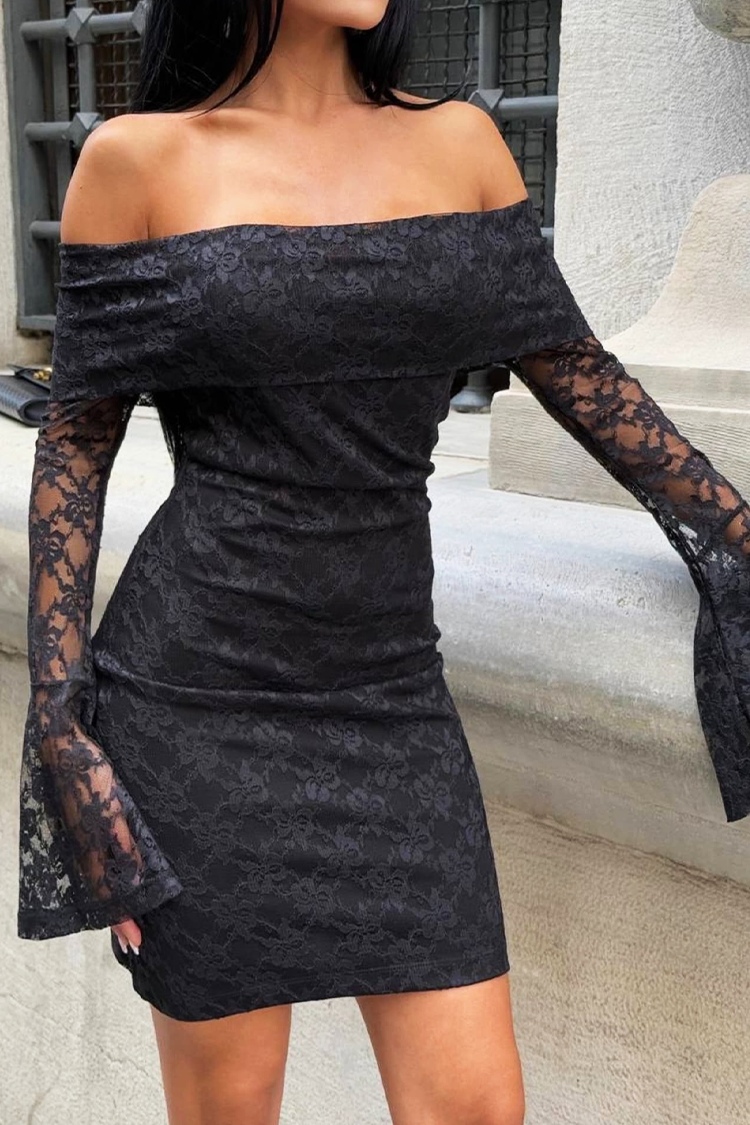 - A modell divatos és testhezálló szabással, látványos csipkével díszített, hosszú ujjú és ejtett vállú.