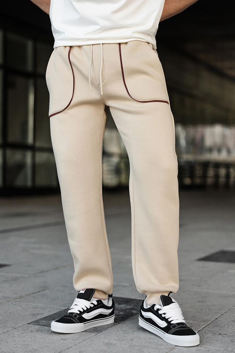 - A modell mindkét oldalon zsebekkel, kényelmes kötős derékkal és egyenes szárral rendelkezik, a végén szűkülő szabással.