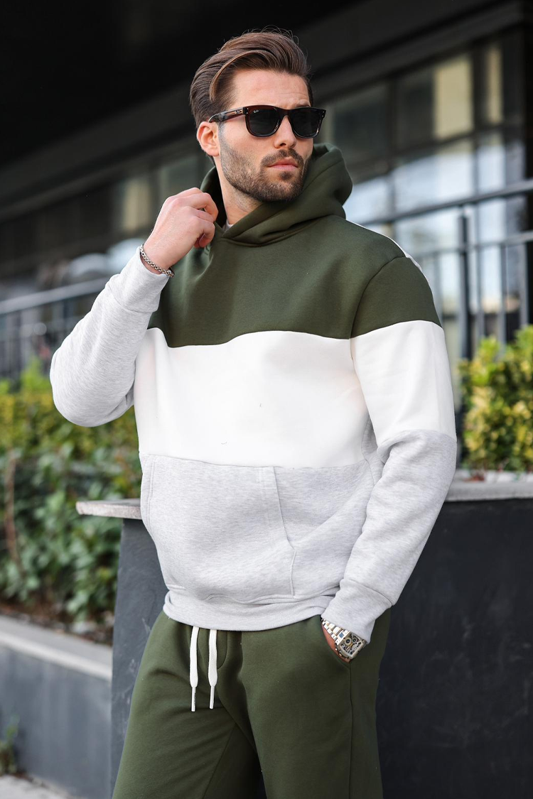 - Sportos, kétrészes, csíkos mintás férfi szett, amely egy kapucnis pulóverből és egy nadrágból áll.