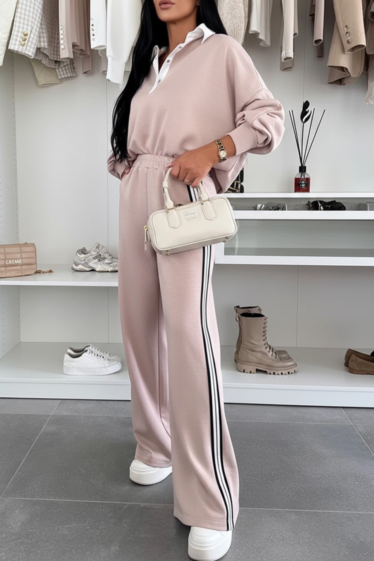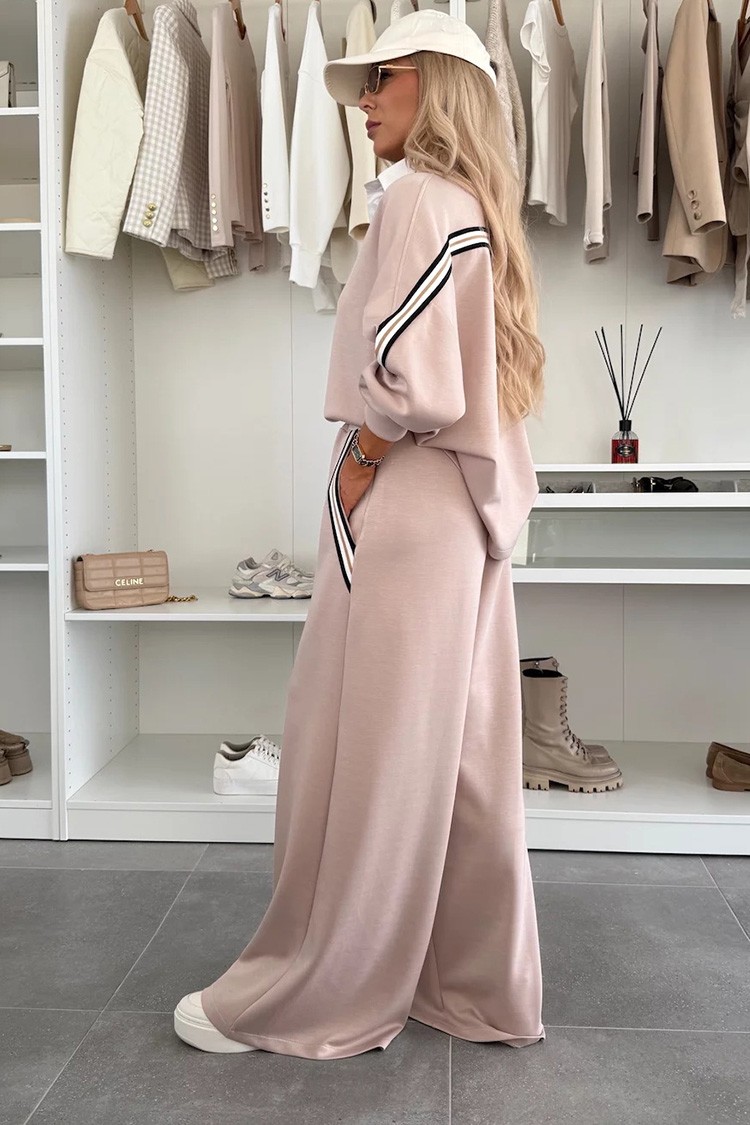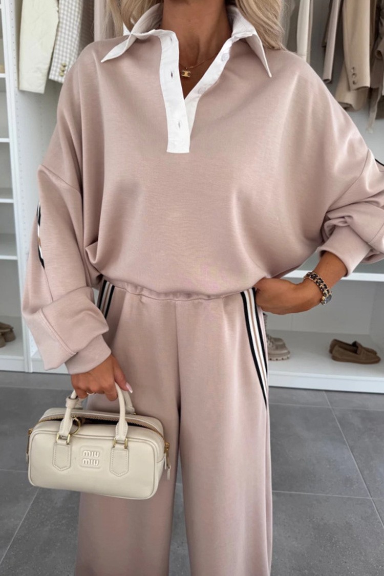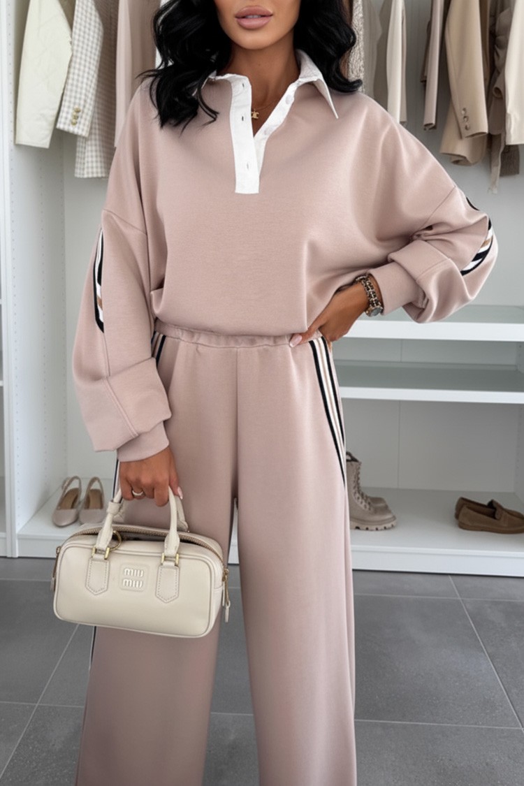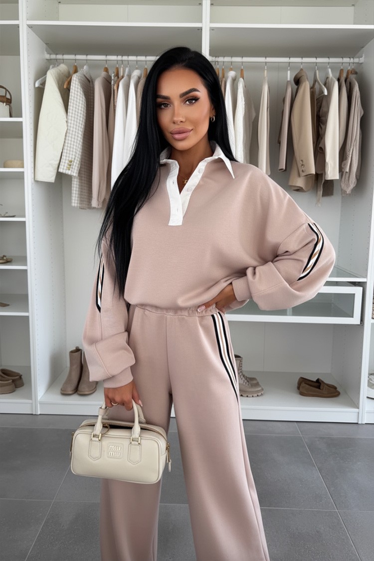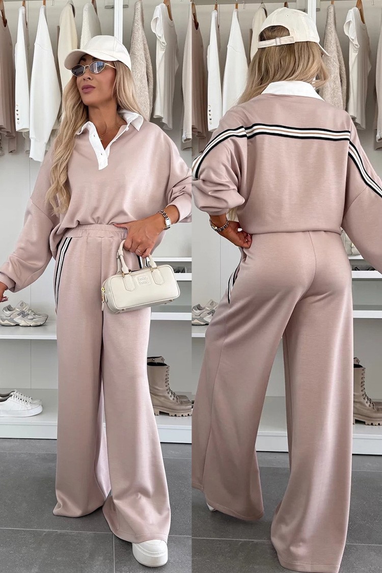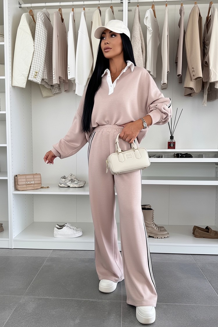 - Vonzó kétrészes szett, amely egy felsöből és egy nadrágból áll, alkalmas mindennapi életre és sportoláshoz.