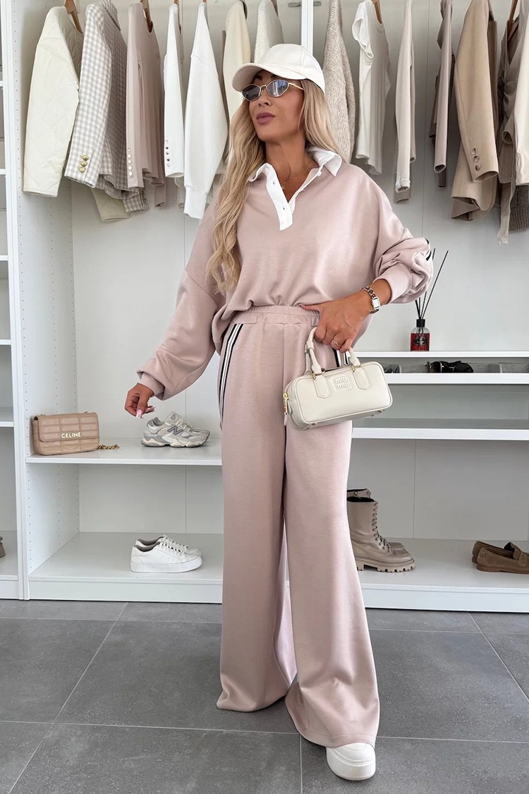 - A felső túlméretezett szabású és látványos gallérral rendelkezik, a nadrág pedig bő szabású és magas, rugalmas derékkal rendelkezik.
