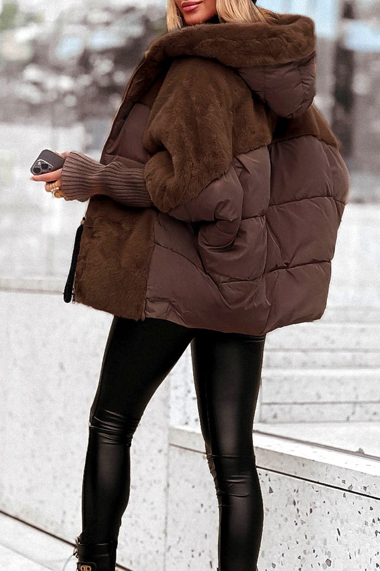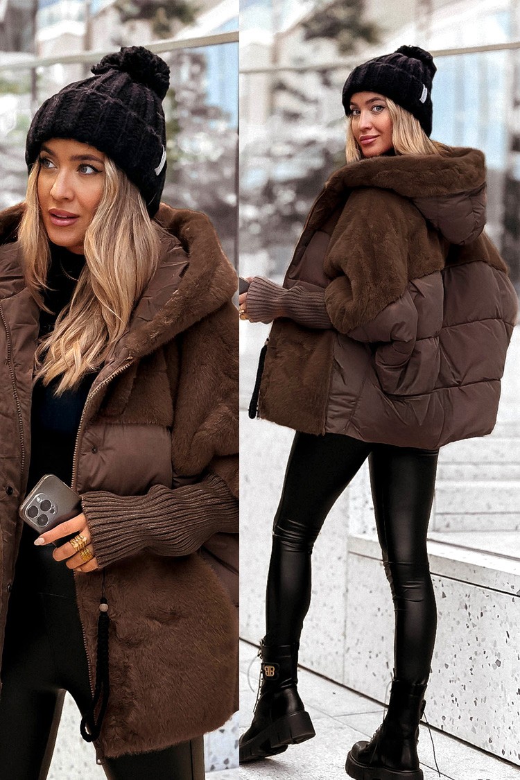 - A modell kényelmes szabással, gombos rögzítéssel, bő kapucnival és teljes hosszában szörmévsl rendelkezik.