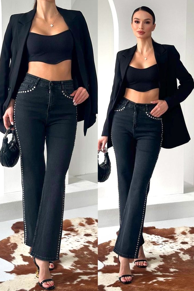 - A modell magas derekú, széles szárú, zsebes és teljes hosszában köves.