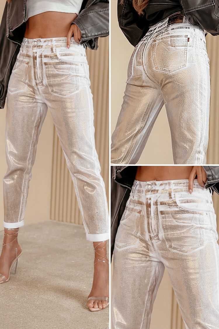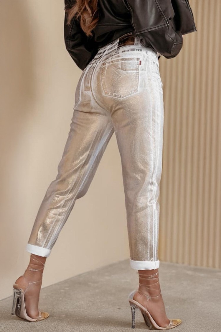 - A modell magas derekú, széles, szegélyezett szárú és látványos csillogású.