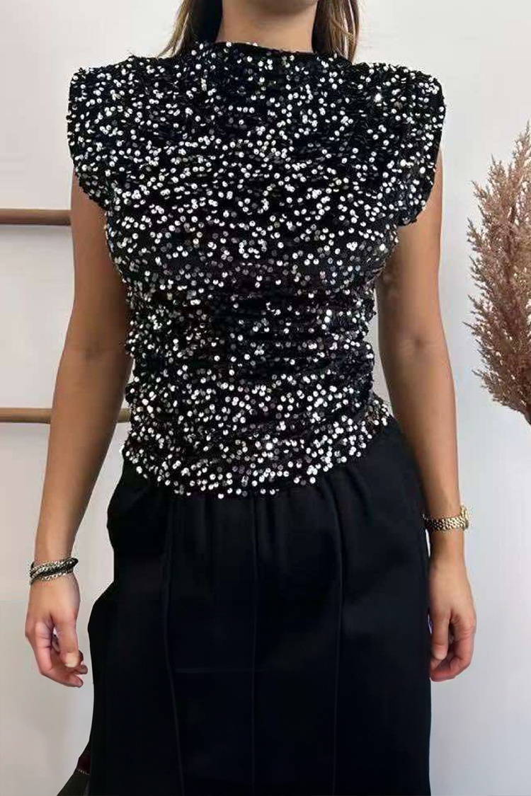 - A felső látványos dizájnnal és teljes hosszában flitterekkel díszített.