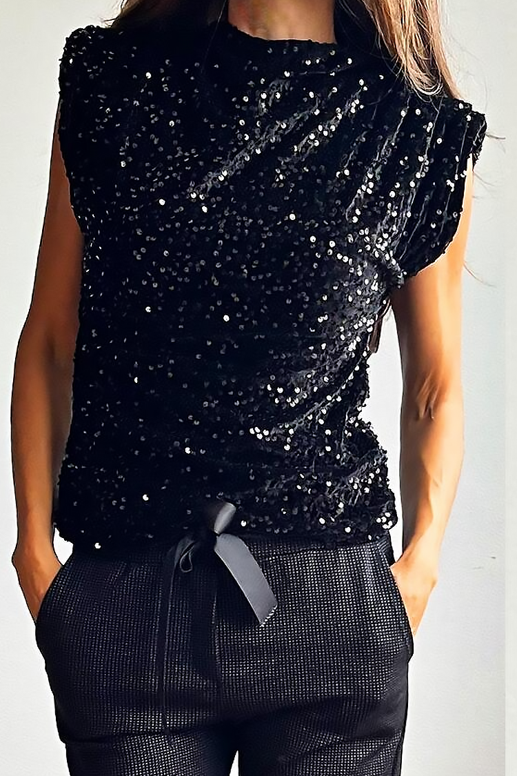 - A felső látványos dizájnnal és teljes hosszában flitterekkel díszített.