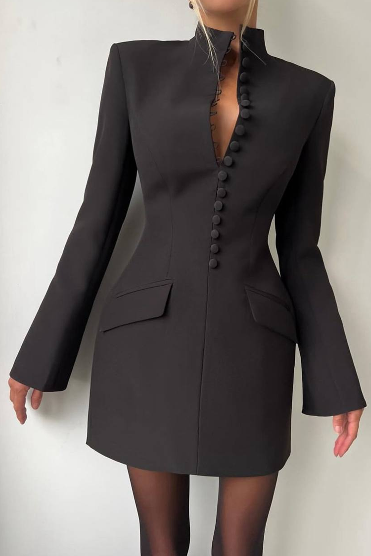 - A ruha elegáns blézer szabással, gombos rögzítéssel, hosszú ujjakkal és stílusos zsebekkel rendelkezik.