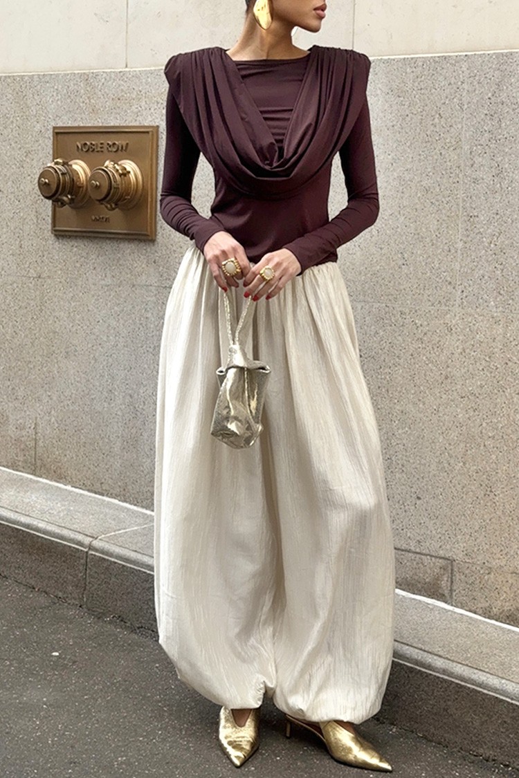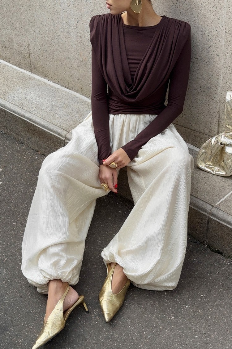 - A blúz hosszú ujjú, látványos szabású és látványos nyakkivágású.
