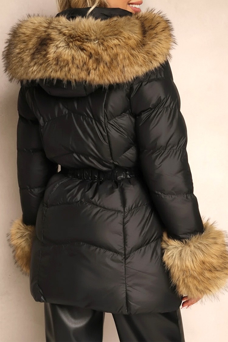 - A modell laza szabású és praktikus szörmés kapucnival rendelkezik, amely az ujjak végén is megtalálható.