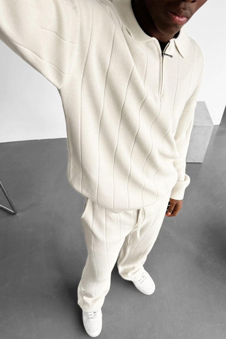 - A felső cipzáras gallérral és hosszú, mandzsettás ujjal rendelkezik a jobb illeszkedés érdekében. A nadrág derekán húzózsinórral és egyenes szárral rendelkezik.