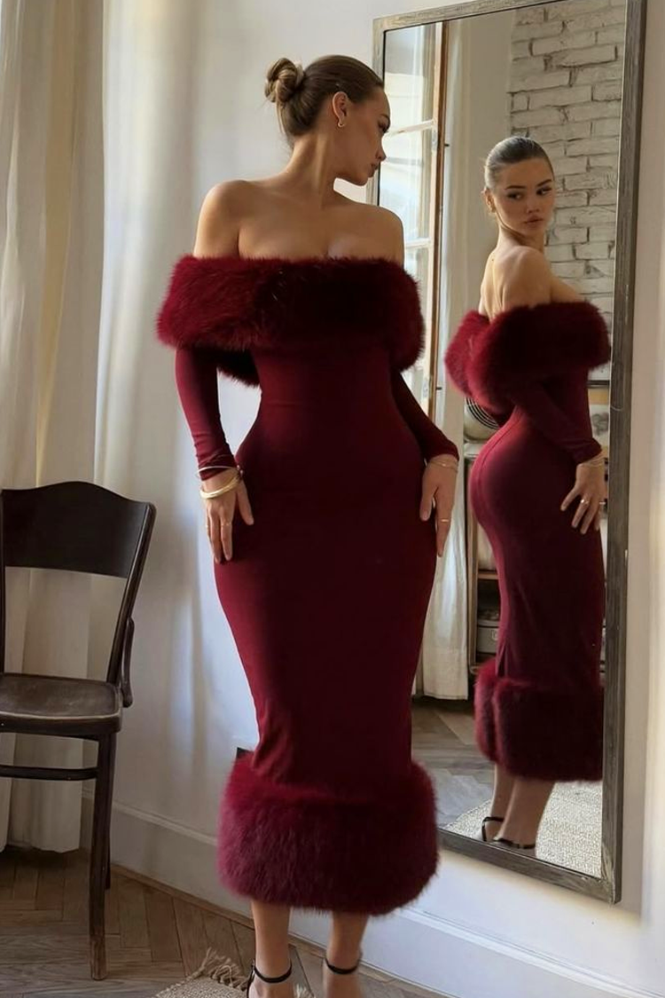 - A modell szexi szabású, ejtett vállal, mélyen sliccelt hátul és puha szörmés díszítéssel rendelkezik.