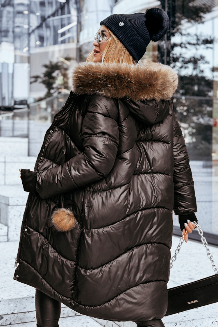- A modell szörmés kapucnival és praktikus zsebekkel ellátott, kapucnival, steppelt kialakítással és dekoratív szörmével rendelkezik a zsebnél.